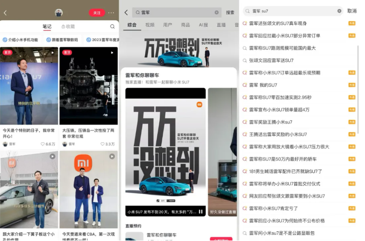 而在线上的营销中,从面向普遍大众的社交媒体、短视频平台、搜索引擎、综合资讯平台,到面向垂直用户的汽车类平台,小米完成了网络空间的遍在性、广泛性和重复性宣传,进一步设置议程,提高了品牌形象的触达,从而提高了讨论的声量。3月23日所进行的发布会,更是通过多达187个渠道进行在线直播,囊括了头部的科技、财经、汽车媒体及资讯、社交、流媒体平台。如此盛大的在线直播和广泛的社会关注,让小米SU7的上市发布会迅速登陆各大网络平台的热搜榜。
