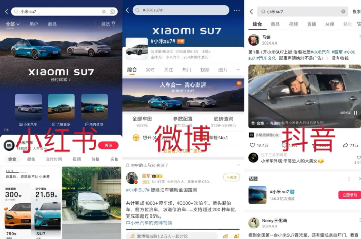 更为重要的是,小米根据每个平台的“调性”和“用户画像”选择了差异化的营销策略。在平台中输入“小米SU7”这一关键词,小红书呈现出了“预约试驾”的功能页面,而在微博、抖音等平台中并没有显著标注这一入口。在微博平台搜索“小米SU7”,页面上方进行简短的品牌形象营销,呈现出车图、配置和价格等关键资讯,一目了然地呈现出基本信息。而在“抖音”平台中,搜索结果页直接导向了平台KOL的相关视频作品,在页面中间嵌入了相关话题页的参与入口。